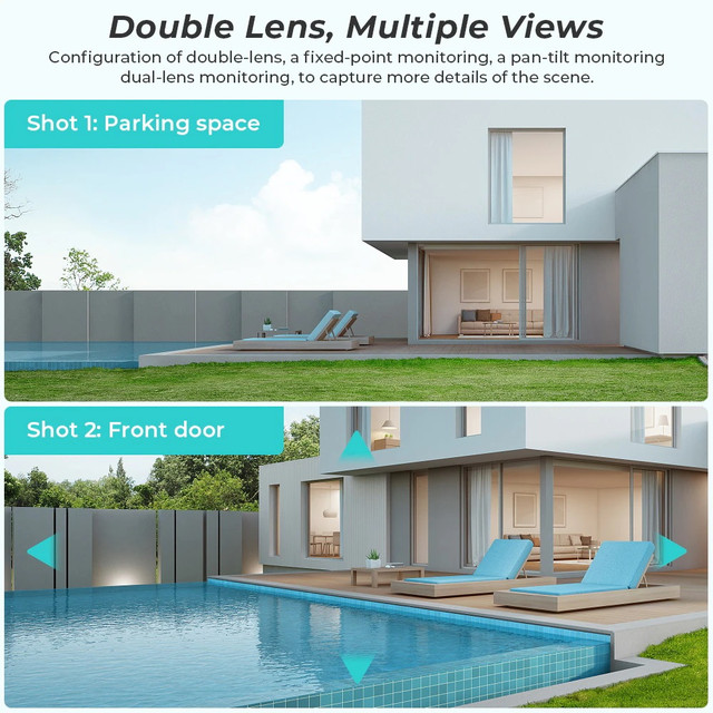 - Подвійний об'єктив із двома датчиками, подвійний екран, ширококутний перегляд + перегляд на великій відстані для забезпечення чіткого спостереження здалеку та поблизу;