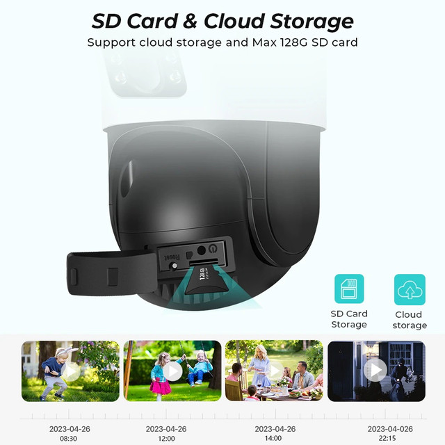Камера підтримує локальне резервне копіювання micro SD-карти обсягом до 128 ГБ (карта не входить до комплекту), а також надає послугу хмарного зберігання (необхідно платити додаткову плату).