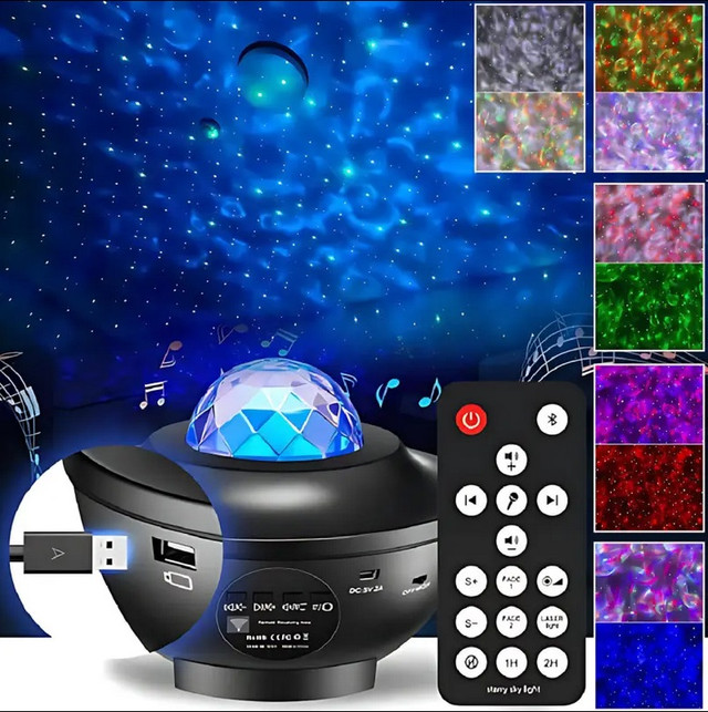 Проєктор йде в комплекті з пультом дистанційного керування (працює від 2 батарейок AAA — не входять до комплекту). Не можна вставати з ліжка або дивана, щоб увімкнути або вимкнути галактичний проєктор. За допомогою пульта дистанційного керування можна також керувати зоряним проєктором, регулювати яскравість, вільно вмикати/вимикати лампу, змінювати режими світіння, музичні пісні, встановлювати таймер.