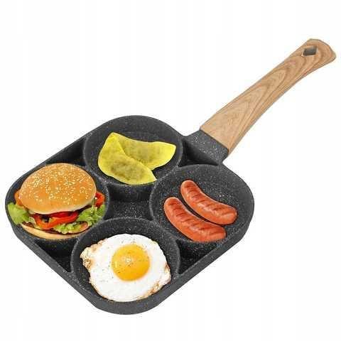 Чотири окремі секції сковороди дають змогу одночасно готувати різноманітні порційні страви, як-от млинці, яєчня, олади або котлети, що особливо зручно для приготування сніданків або швидких обідів. Зручна ручка, яка не нагрівається, забезпечує безпечне та комфортне використання сковороди.